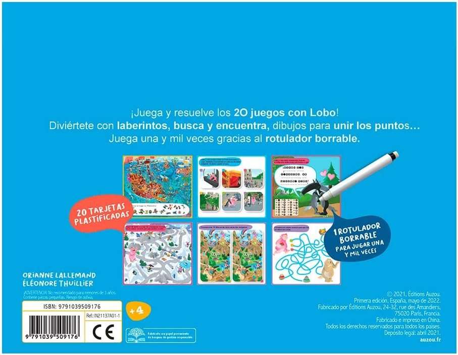 20 Juegos con Lobo de la editorial Auzou es una divertida colección de actividades protagonizadas por el entrañable personaje del Lobo, muy querido por los más pequeños. Con este cuaderno interactivo, los niños podrán disfrutar de 20 juegos diferentes, entre los que se incluyen laberintos, sopas de letras, juegos de observación, unir los puntos, colorear y mucho más, todo con ilustraciones coloridas y llenas de humor.