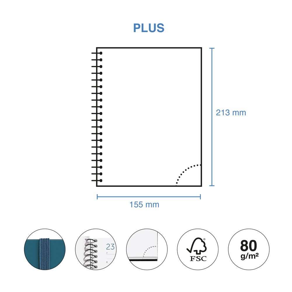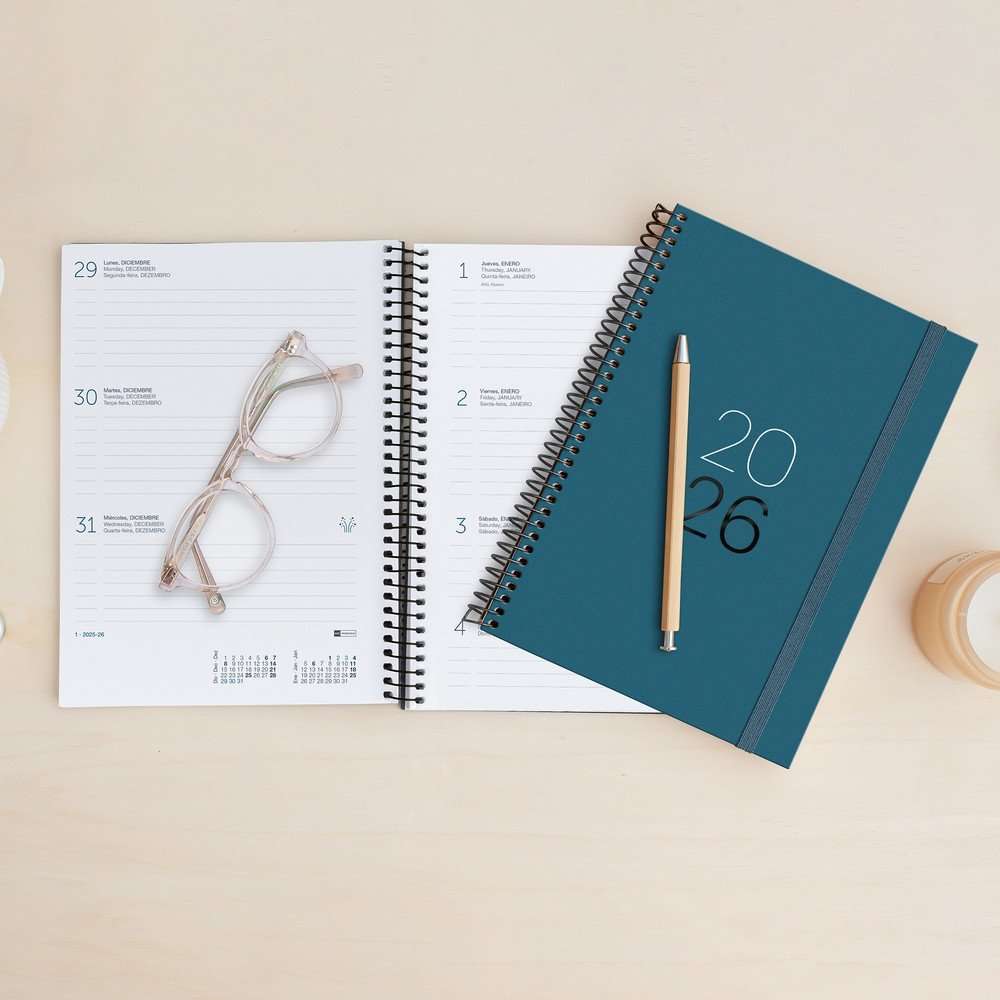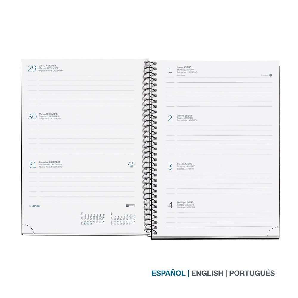 Anualidad: Semana a la vista horizontal (S/V), de Enero a Diciembre 2026. Idiomas: Castellano – Inglés – Portugués. Encuadernación espiral. Hojas microperforadas en la esquina para señalar la fecha actual. Goma elástica para cerrar. Contenido: Anualidad semana a la vista (vertical u horizontal) o día por página (sábado y domingo en página completa), hoja de datos personales, calendarios 3 años, calendario bimensual en cada doble página, recomendaciones, fechas a recordar, planning mensual, hojas para notas y hojas para direcciones. Festivos nacionales y portugueses. Iconos que indican: cambio horario, inicio estaciones, año nuevo chino, carnaval y lluvia de estrellas (entre otros).
