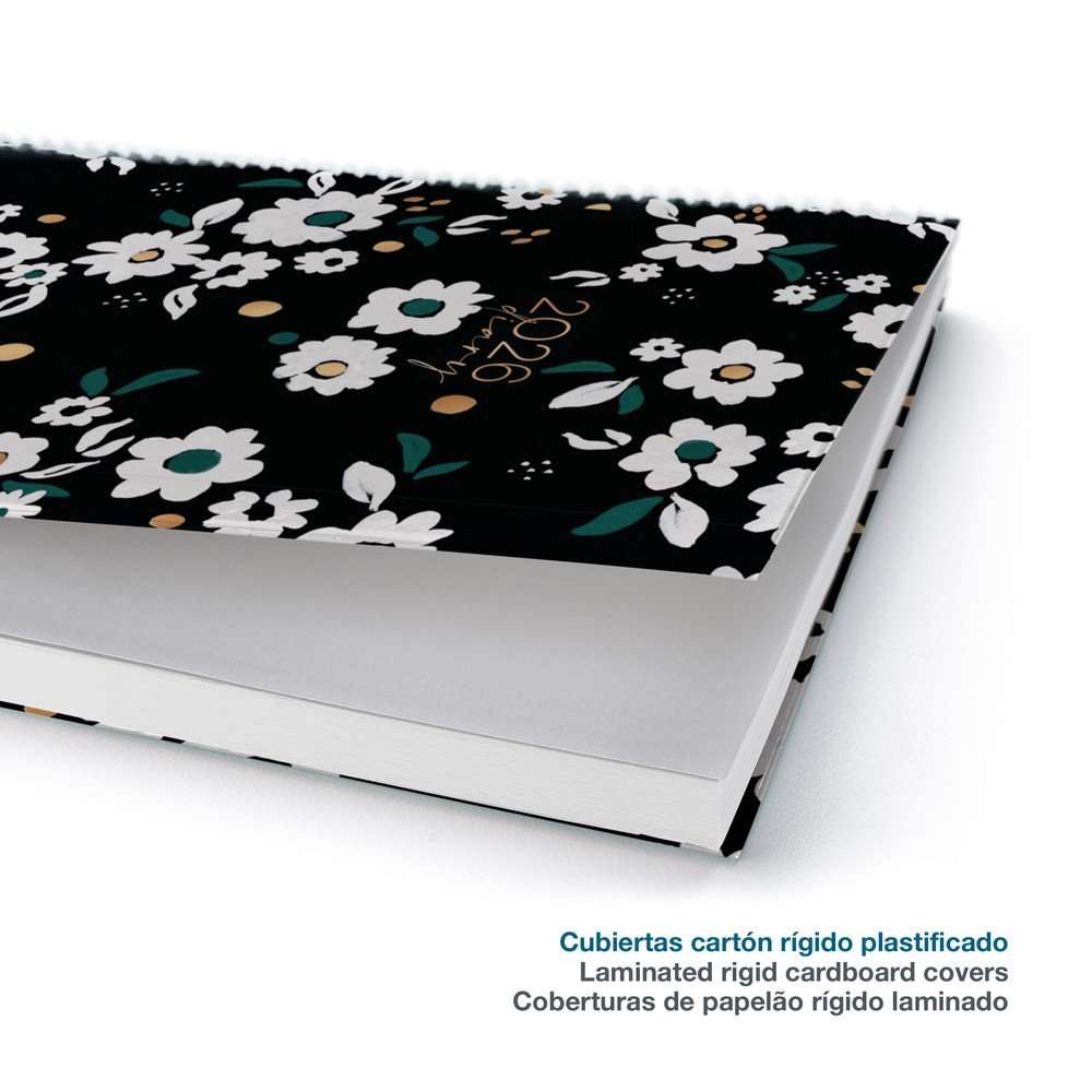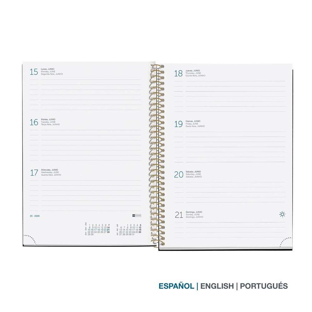 Anualidad: Semana a la vista horizontal (S/V), de Enero a Diciembre 2026. Idiomas: Castellano – Inglés – Portugués. Encuadernación espiral. Hojas microperforadas en la esquina para señalar la fecha actual. Goma elástica para cerrar. Contenido: Anualidad semana a la vista horizontal, hoja de datos personales, calendarios 3 años, calendario bimensual en cada doble página, recomendaciones, fechas a recordar, planning mensual, hojas para notas y hojas para direcciones. Festivos nacionales y portugueses. Iconos que indican: cambio horario, inicio estaciones, año nuevo chino, carnaval y lluvia de estrellas (entre otros).
