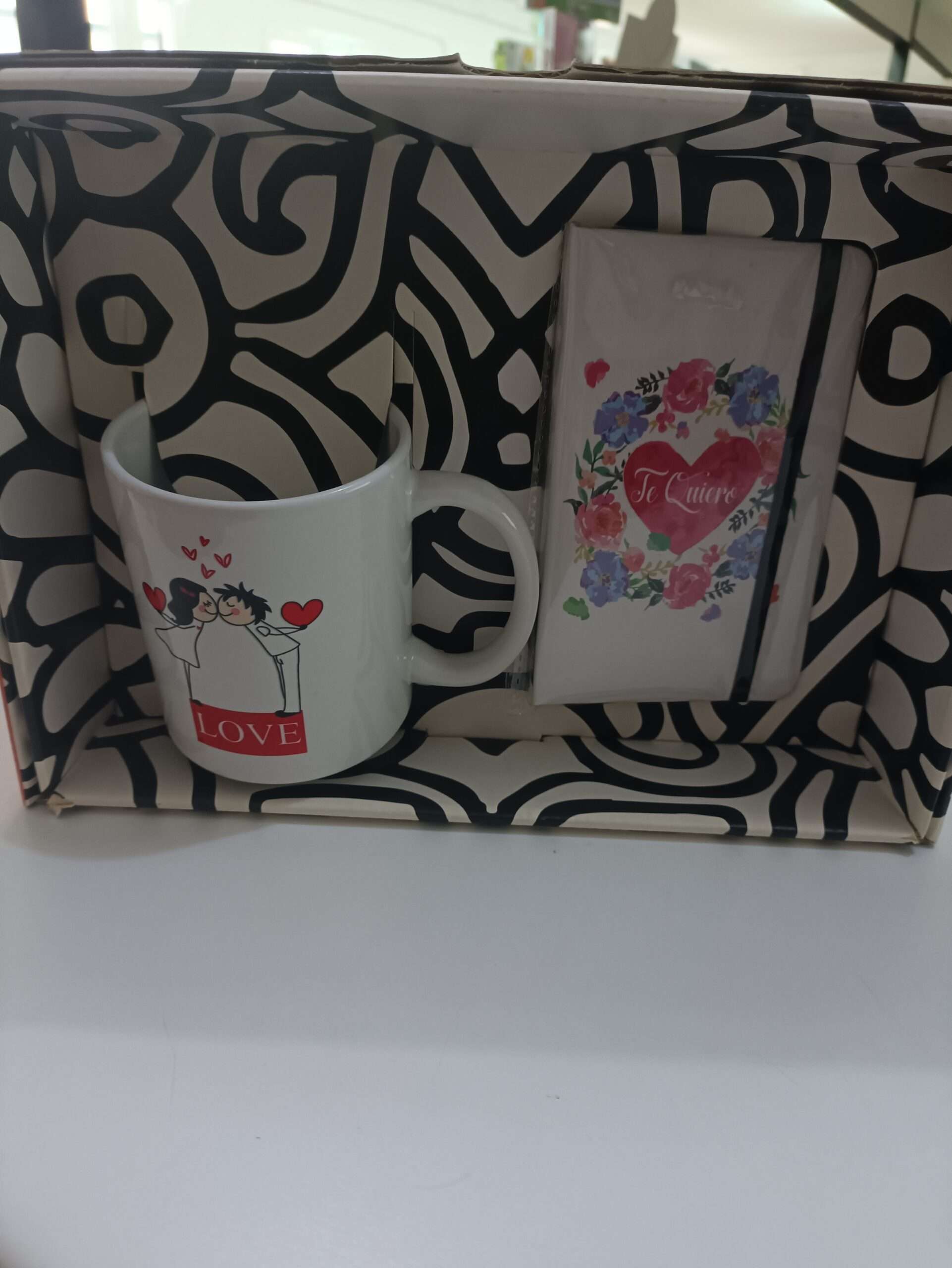 «Caja Taza y Libreta Te Quiero» es un set de regalo con temática romántica, presentado en una caja decorativa ideal para sorprender en ocasiones especiales. El conjunto incluye una taza de cerámica de color blanco con un diseño ilustrado de una pareja y la palabra “LOVE”, acompañada de pequeños corazones que refuerzan el mensaje de cariño y afecto. La taza es adecuada para bebidas calientes como café, té o chocolate, siendo práctica para el uso diario y, al mismo tiempo, un bonito recuerdo sentimental.