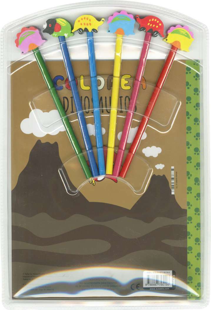 Contiene: un libro para colorear , 6 lápices de colores y 6 borradores en forma de dinosaurios.