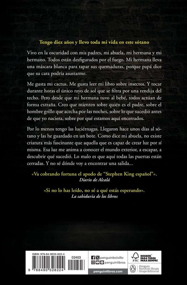 Por lo menos tengo luciérnagas. Llegaron hace unos días al sótano y las he guardado en un bote, Como dice mi abuela, no existe criatura más fascinantes que aquella que es capaz de crear luz por sí misma. Esa luz me anima a conocer el mundo exterior, a escapar, a descubrir qué sucedió. Lo malo es que aquí todas las puertas están cerradas. Y no sé dónde voy a encontrar una salida…