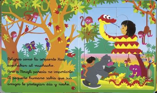 El Libro de la Selva Con 6 Puzzles, este fantástico libro interactivo que combina la lectura con el juego. En cada una de sus páginas, los más pequeños podrán disfrutar de coloridas ilustraciones y textos sencillos que narran las aventuras de Mowgli, Baloo, Bagheera y Shere Khan, los personajes más queridos de la selva.