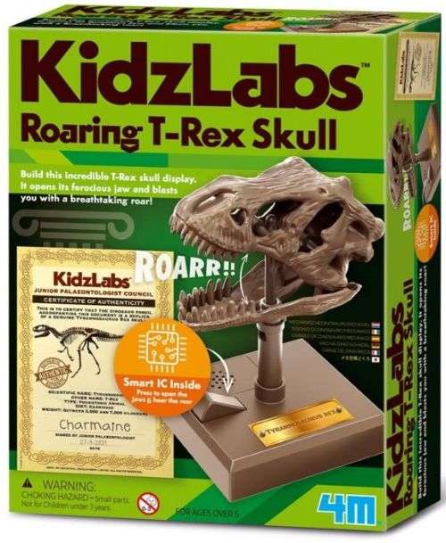 Los pequeños podrán montar las piezas paso a paso, descubriendo cómo funcionan las mandíbulas, los engranajes y los mecanismos internos, mientras aprenden curiosidades fascinantes sobre los dinosaurios. El resultado final es un cráneo articulado y realista que abre y cierra la boca, ideal para exhibir o jugar.