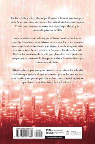America todavía no está segura de hacia dónde se inclina su corazón. Cuando está con Maxon, se ve envuelta en un romance nuevo y que la deja sin aliento, y ni siquiera puede imaginar estar con nadie más. Pero cuando ve a Aspen en los alrededores de palacio, los recuerdos de la vida que planeaban tener juntos se agolpan en su memoria.