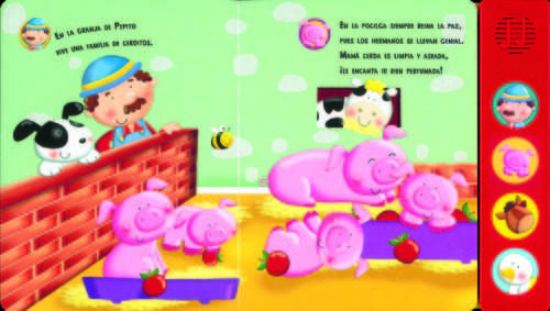 En La granja musical, los niños descubrirán vacas, caballos, cerdos y patitos mientras disfrutan de divertidas rimas y presionan los 4 botones sonoros para escuchar la canción y los sonidos de los animales.