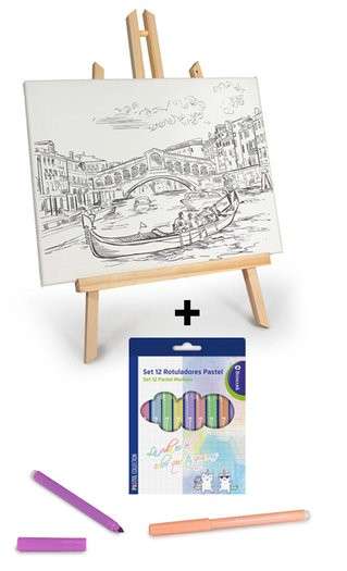 Contenido: lienzo con caballete + 12 rotuladores pastel.