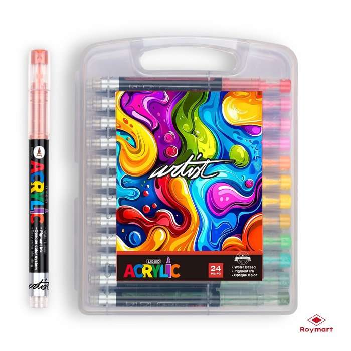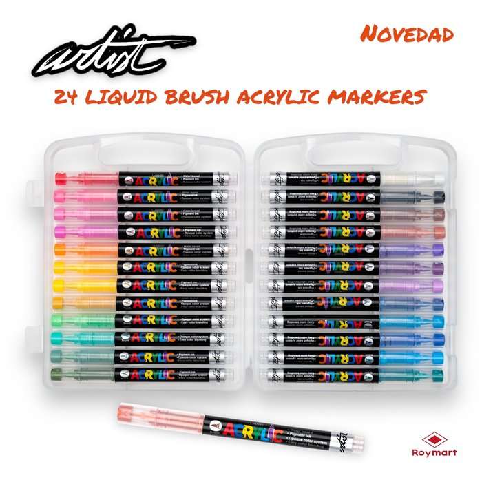 Descubre este completo set de 24 rotuladores acrílicos con punta Real Brush, diseñados para ofrecer una experiencia de pintura fluida, versátil y profesional. Cada trazo se siente como un pincel, permitiendo desde líneas finas y precisas hasta degradados suaves y rellenos amplios.