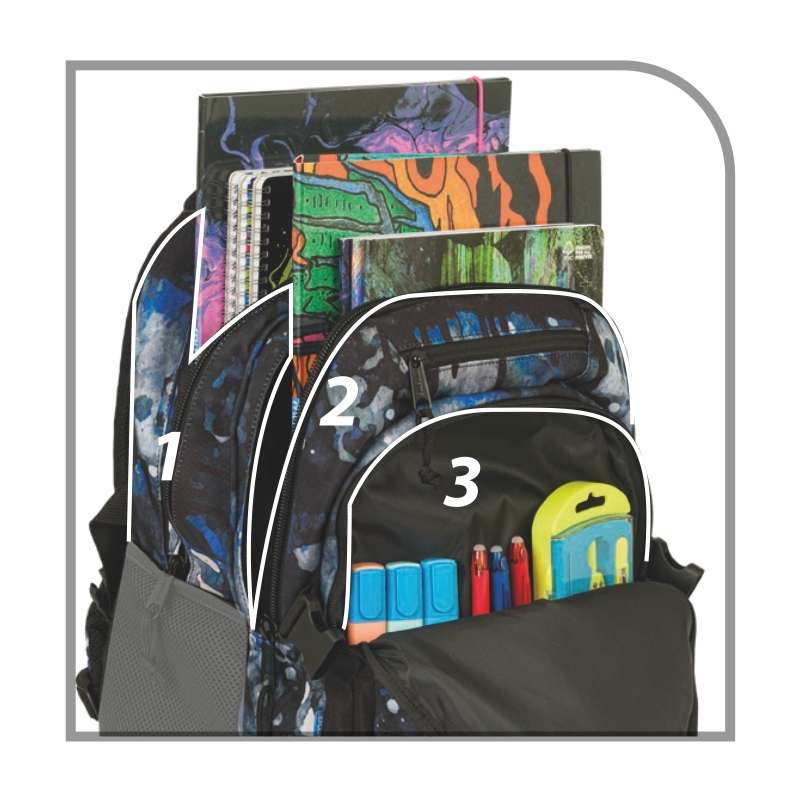 Dispone de tres compartimentos, el principal es amplio para libros, carpetas y material escolar, además de un bolsillo delantero que permite guardar objetos más pequeños o de uso rápido, otro de los compartimentos vale para guardar tu portátil. Sus asas acolchadas y ajustables garantizan un transporte cómodo y ergonómico, mientras que el asa superior reforzada facilita colgarla o llevarla en la mano. Además contiene un Puerto USB-C.