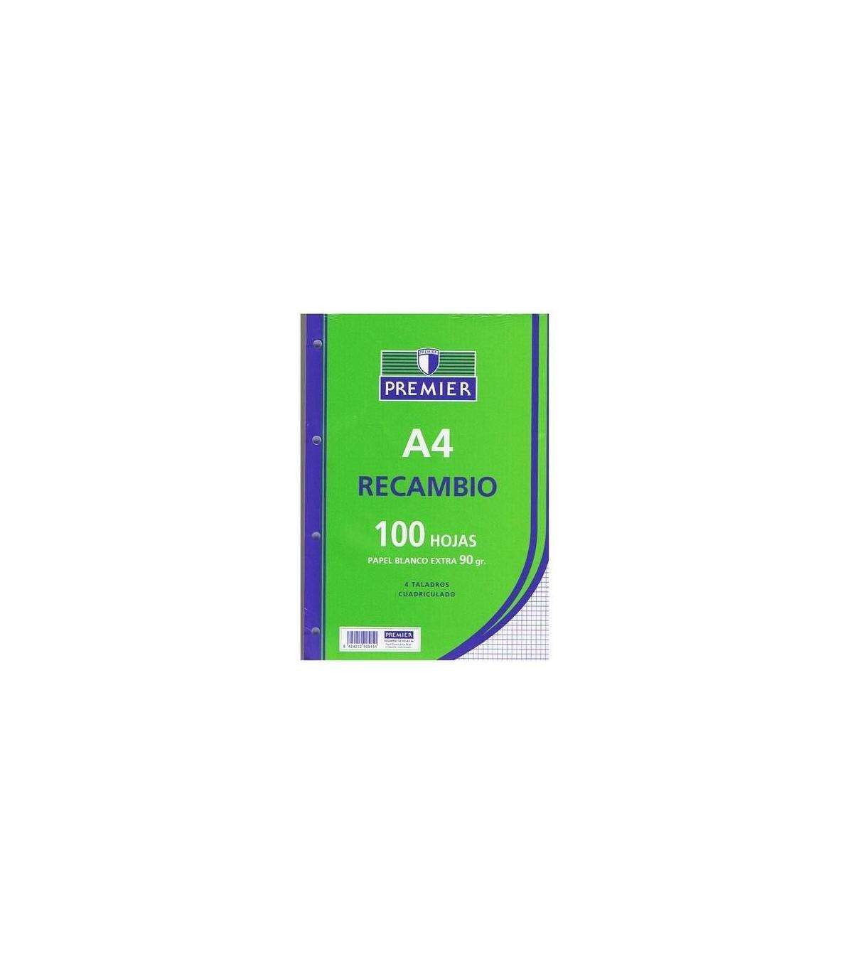 EAN: 8424212805154 Colección: Premier Gramaje: 90 gr Nº Hojas: 100 Rayado: Cuadro 4 mm Tamaño: A4 Acabado Papel: Blanco Extra Tipo Recambio: Carpeta Anillas Fabricante: Manipulados Zorrilla Materia: Recambios