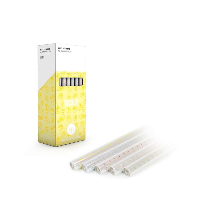 Cada rollo mide 70 cm de ancho por 1,5 metros de largo, ofreciendo el tamaño ideal para envolver regalos medianos y grandes, o bien para ser utilizado en manualidades y proyectos de decoración. Su transparencia con efecto decorativo permite realzar el contenido interior, aportando un acabado original y sofisticado. Con 6 colores diferentes: Amarillo, azul, blanco, rojo, rosa y verde.